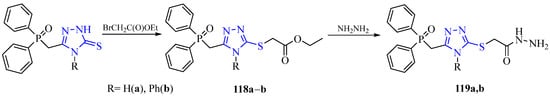 - Krutov, I.A.; Gavrilova, E.L.; Burangulova, R.N.; Kornilov, S.S.; Valieva, A.A.; Samigullina, A.I.; Gubaidullin, A.T.; Sinyashin, O.G.; Semina, I.I.; Nikitin, D.O.; et al. Modification of Diphenylphosphorylacetic Hydrazide with Thiosemicarbazide and Triazole Units. Russ. J. Gen. Chem. 2017, 87, 2794–2800. [Google Scholar] [CrossRef]