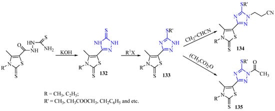 - Knyazyan, A.M. Synthesis of 5-(2-Thioxo-3H-thiazol-5-yl)-[1,2,4]triazole-3-thione Derivatives Exhibiting Fungicidal and Growth-Stimulating Activity. Khimičeskij žurnal Armen. 2012, 65, 94–104. [Google Scholar][Green Version]