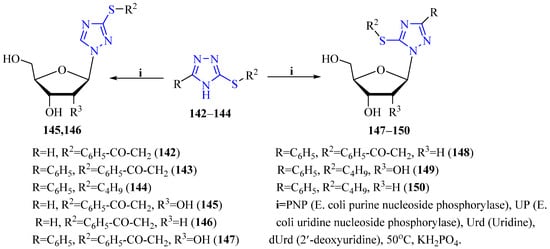- Fateev, I.V.; Sasmakov, S.A.; Abdurakhmanov, J.M.; Ziyaev, A.A.; Khasanov, S.S.; Eshboev, F.B.; Ashirov, O.N.; Frolova, V.D.; Eletskaya, B.Z.; Smirnova, O.S.; et al. Synthesis of Substituted 1,2,4-Triazole-3-Thione Nucleosides Using E. coli Purine Nucleoside Phosphorylase. Biomolecules 2024, 14, 745. [Google Scholar] [CrossRef] [PubMed]