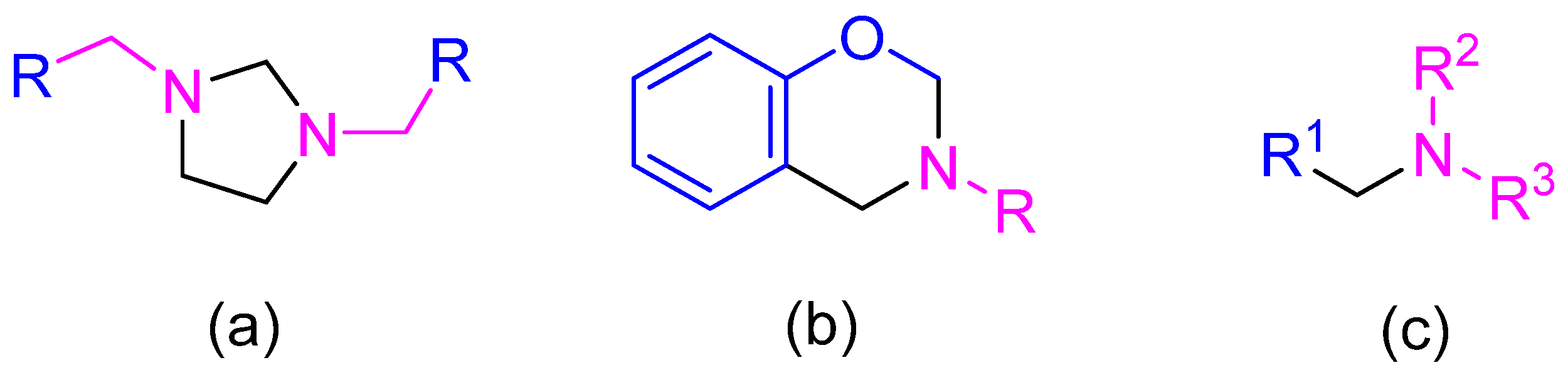 Figure 1. Chemical structure of Mannich bases: (a) Imidazolidines, (b) Benzoxazine-type compounds; (c) alkyl- or arylmethylenedialkylamines (blue represents H active fragment precursor, and fuchsia represents amine fragment precursor).