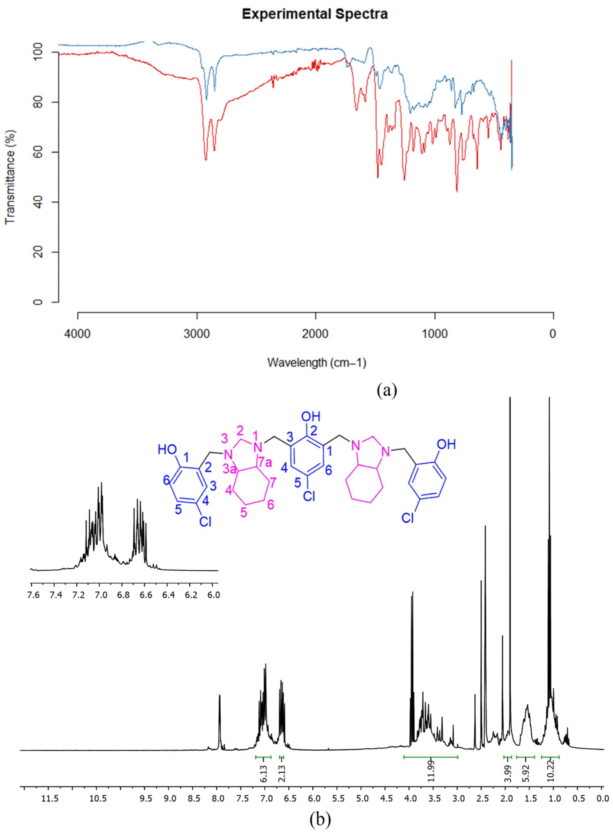 Figure 2. Characterization data of compounds 2cd: (a) FT-IR-ATR spectra of compounds 2cd (red line for compound 2c and blue line for compound 2d); (b) 400 MHz 1H NMR spectrum of 2c in DMSO-d6.