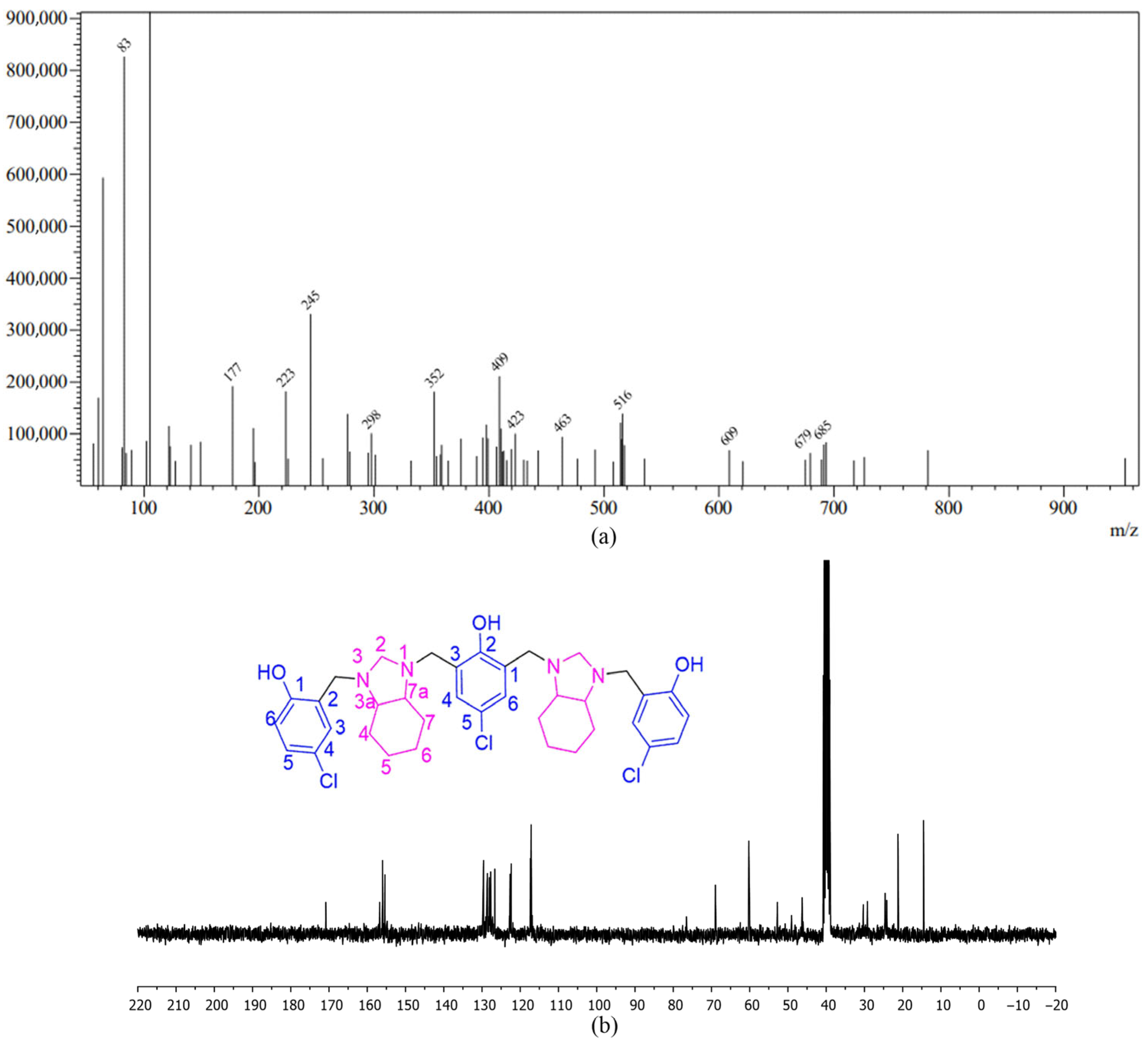The 13C NMR spectrum in CDCl3 or DMSO-d6 (Figure 3b) showed that the diastereomers of the compound have many similar carbon signals, but slight differences in their chemical shifts help distinguish them. For the enantiomeric pair, specific signals correspond to carbons in the perhydrobenzimidazole ring, reflecting the symmetry of this part of the molecule. The aminal carbons appear at around 76 ppm, highlighting their connection to electronegative nitrogen atoms. Benzyl and aromatic carbons each show characteristic signals at various chemical shifts. The meso isomer exhibits very similar carbon signals overall, with only slight differences in the exact chemical shifts, which make it distinguishable from the enantiomers. Mass spectrometry (ESI-MS) results in positive mode confirm the molecular composition of the compound 2c (Figure 3a). The [M+H]+ ion exhibited an experimental value of m/z 685, with characteristic chlorine isotopically ions at m/z 686, 687, and 688.