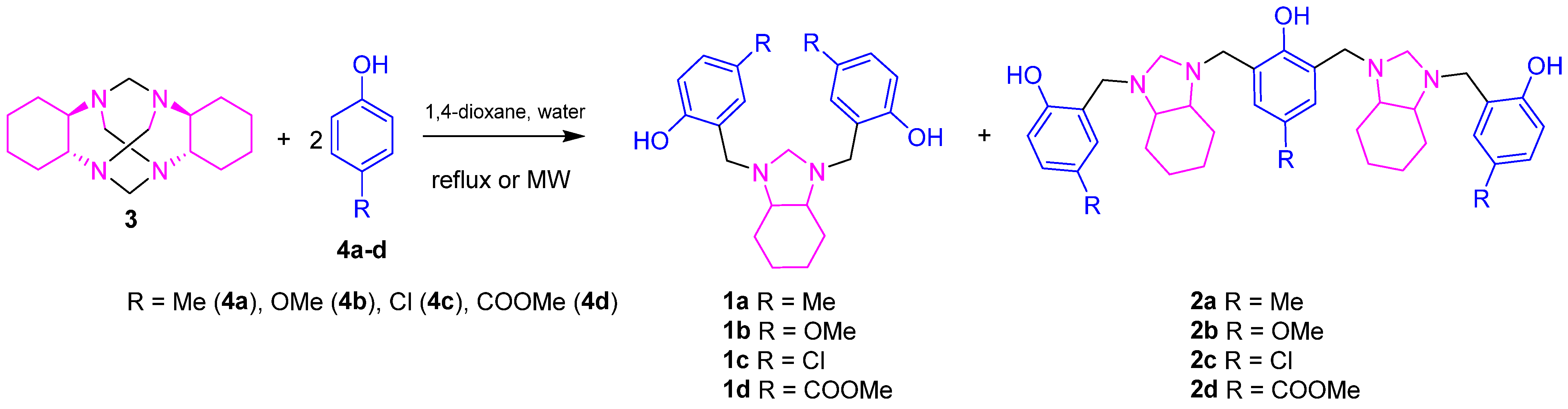 To an aminal 3 in 1,4-dioxane dilution (previously synthesized from trans-(rac)-1,2-diaminocyclohexane) [29] (1.00 mmol in 3 mL), a mixture of para-substituted phenol 4ad (2.00 mmol) in 1,4-dioxane (3.0 mL) was added. p-substituted phenols employed in these experiments were carefully selected to represent a diverse range of electronic effects: R = Cl (an electron-withdrawing group by inductive effect), Me and MeO (electron-donating groups via inductive and resonance effects), and COOMe (a strongly electron-withdrawing group through both resonance and induction). The reaction mixture was stirred at room temperature. After 10 min, water (4.0 mL) was added. The mixture was then subjected to microwave-assisted heating under controlled conditions. All reactions were performed in a closed vessel using a single-mode Discover System microwave reactor. The system operated at a constant microwave power of 200 W, with internal pressure maintained between 0 and 10 psi. Reactions were conducted at three distinct temperatures (80 °C, 100 °C, and 120 °C) to evaluate the effect of temperature on the product yield. Each experiment was carried out in triplicate to ensure reproducibility. Upon completion of the 40-min heating period, the solvent was distilled under reduced pressure. Products were purified by column chromatography on silica gel using gradient elution with mixtures of hexanes and ethyl acetate of increasing polarity. Final products 1ad and 2ad were isolated and characterized by 1H and 13C NMR, high-resolution electrospray ionization mass spectrometry (HR-ESI-MS), and Fourier-transform infrared (FT-IR) spectroscopy. The obtained spectroscopic data are in agreement with literature values [22,30,31], and could be consulted in the Supplementary Material. Yields of compounds 1ad and 2ad were calculated based on the isolated product weights and are reported in Table 1 as the mean values ± standard deviation from the three independent experiments.