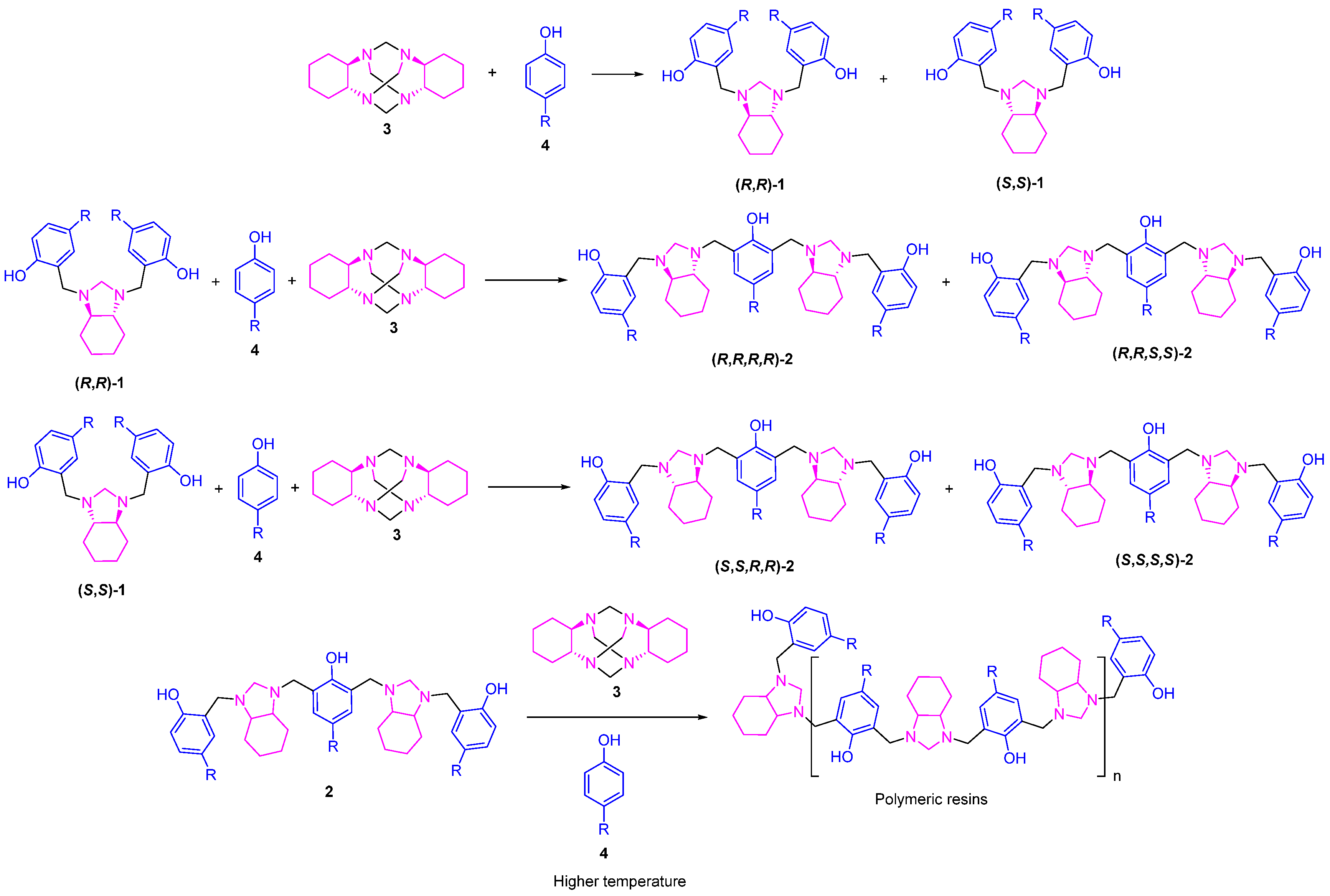 Compared to conventional heating, microwave-assisted reactions provide higher yields in significantly shorter times [26]. In this study, at higher temperatures (100 °C and 120 °C), MW-assisted protocols generally generated lower yields of compound 1ad than the conventional reflux protocol, particularly for phenols with the Me and OMe substituents. These results suggest that MW irradiation may favor the formation of compounds 2ad over compounds 1ad. Furthermore, the formation of a greater amount of highly polar resins was detected, which remained retained in the silica gel during the purification process. As the temperature increases, the MW reaction appears to favor a different pathway than the conventional one, leading to polymerization reactions, possibly due to the more efficient and homogeneous distribution of heat in the system, facilitating the formation of alternative products. The yields of 1ad decreased considerably at 120 °C in the presence of MWs, suggesting that electronic activation via MWs could modify the reaction mechanism, favoring the formation of 2ad, which could continue to react with the cyclic aminal 3ad until its complete consumption (Scheme 2). This mechanistic purpose is based on the previously reported results obtained for the reaction between the aminal TATD [21], where the key mechanism governing the formation of both cyclic and linear products relies on the preliminary arrangement of intermolecular hydrogen type interactions. Under solvent-free conditions and at high temperatures, these hydrogen bonds break the strong intramolecular interactions of the Mannich bases, allowing new interactions with cyclic aminal. If both hydrogen bonds are formed with nitrogens from the same ethylenediamine unit (1,2-diamine), a preorganization leading to macrocyclic cyclization is favored. In contrast, if the bonds involve nitrogens from different ethylenediamine units, cyclic aminal opens, favoring the formation of linear oligomers. Likewise, the simultaneous interaction of a TATD or 3 molecule with Mannich bases 1 can generate other linear oligomers, depending on the type of diamine involved (1,2 or 1,1). Regarding the stereochemistry of the products, this proposal explains the formation of racemic mixtures for products 1 and diastereomeric mixtures for products 2. In this sense, when the phenol used reacts with the aminal in the first aminomethylation step, it has the same probability of forming both the (R, R)- and (S, S)-1 stereoisomers, since no symmetry element can alter the chemical environment over the reactive amine centers, generating any selectivity. When this occurs, any of the enantiomers can react with a second molecule of the aminal, forming compounds 2, such that if the (R, R)-1ad isomer reacts, it will form the (R, R, R, R)- or (R, R, S, S)-2 diastereomers. The same will occur with the enantiomer (S, S)-1, which will lead to the formation of the diastereoisomers (S, S, R, R)- or (S, S, S, S)-2.