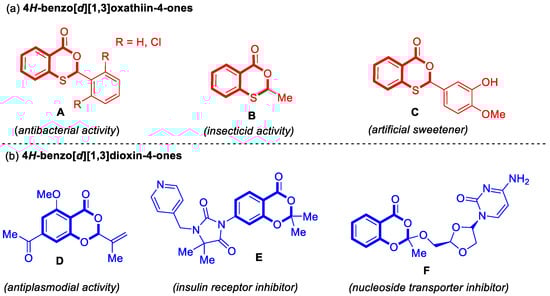 Examples of important 4H-benzo[d][1,3]oxathiin-4-ones and 4H-benzo[d][1,3]dioxin-4-ones in the fields of pharmaceutical chemistry, agriculture, and the food industry. (a) 4H-benzo[d][1,3]oxathiin-4-ones; (b) 4H-benzo[d][1,3]dioxin-4-ones.