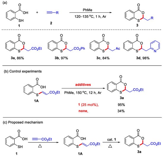 (a) Transition-metal-free protocol for the synthesis of 4H-benzo[d][1,3]oxathiin-4-ones from thiosalicylic acid and activated alkynes; (b) control experiments; (c) the proposed mechanism. Adapted from [23].