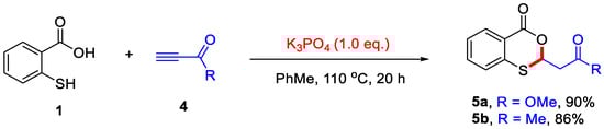 K3PO4-mediated synthesis of 4H-benzo[d][1,3]oxathiin-4-ones from thiosalicylic acid and activated alkynes. Adapted from [24].
