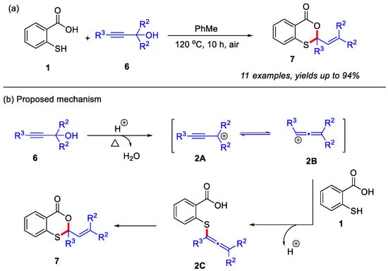 In 2021, the Muthusamy group reported a novel metal-free approach for the synthesis of 4H-benzo[d][1,3]oxathiin-4-ones from thiosalicylic acid and propargyl alcohols under open-air conditions (Scheme 3a) [25]. Various propargyl alcohols were employed to react with thiosalicylic acid, affording the corresponding 2,2-disubstituted 4H-benzo[d][1,3]oxathiin-4-ones in excellent yields. Control experiments confirmed that although the Meyer-Schuster rearrangement could potentially generate an α,β-unsaturated carbonyl intermediate during this process, this species failed to yield the desired product under the optimized conditions. Therefore, a more plausible mechanism was proposed in Scheme 3b. Initially, propargyl alcohol undergoes protonation under reflux conditions to form the propargylium cation 2A, which subsequently tautomerizes into the more reactive allenyl cation 2B. This intermediate 2B then undergoes nucleophilic attack by the thiol group of thiosalicylic acid, leading to the formation of the critical thioether intermediate 2C. This intermediate ultimately gives rise to the final product 7 through an intramolecular cyclization process.
