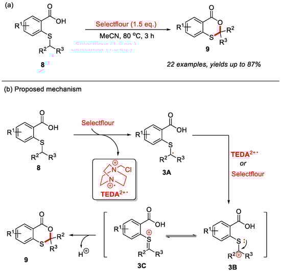 In addition to thiosalicylic acids, 2-(alkylthio)benzoic acids can also serve as suitable substrates for the construction of 4H-benzo[d][1,3]oxathiin-4-ones through C–H bond functionalization. In 2021, our group first reported a novel transition-metal-free strategy for the synthesis of 4H-benzo[d][1,3]oxathiin-4-ones through intramolecular α-C(sp3)–H bond cyclization of 2-(alkylthio)benzoic acids (Scheme 4a) [26]. Utilizing Selectfluor [1-chloromethyl-4-fluoro-1,4-diazoniabicyclo-[2.2.2]octane bis(tetrafluoroborate)] as the crucial additive, this reaction efficiently constructs a variety of 2-substituted and 2,2-disubstituted 4H-benzo[d][1,3]oxathiin-4-ones in good to excellent yields. Moreover, the reaction exhibits excellent functional group tolerance, accommodating diverse substituents on the sulfur atom as well as various electron-donating and electron-withdrawing groups on the benzene ring. In this reaction, Selectfluor may serve as the radical initiator [27,28,29]. Mechanistic studies suggest that the initial single-electron transfer between 2-(alkylthio)benzoic acid 8 and Selectfluor generates radical intermediate 3A and TEDA2+·(N-(chloromethyl)triethylenediamine radical dication). Intermediate 3A is subsequently re-oxidized by Selectfluor or TEDA2+·to form carbocation 3B, which rapidly isomerizes into the more stable oxonium ion intermediate 3C. Ultimately, intramolecular nucleophilic attack triggers cyclization, which is subsequently followed by deprotonation to yield the final product 9 (Scheme 4b).
