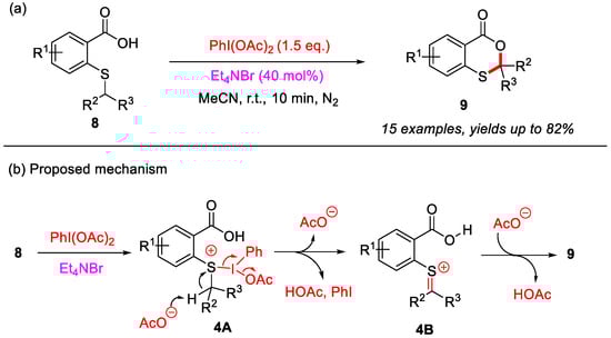 In 2023, the Jana group reported a PhI(OAc)2-mediated intramolecular α-C(sp3)–H bond cyclization of 2-(alkylthio)benzoic acids for the construction of 4H-benzo[d][1,3]oxathiin-4-ones (Scheme 5a) [30]. Notably, this reaction affords the desired products in good yields within 10 min at room temperature. Moreover, Et4NBr (tetraethylammonium bromide) may enhance the solubility of PhI(OAc)2 in the reaction medium, thereby facilitating the cyclization process. During the experimental investigation, it was observed that thiosalicylic acids were oxidized by PhI(OAc)2 to sulfoxide intermediates. However, these sulfoxide intermediates could not be converted into the desired products under standard reaction conditions. Based on these findings, a plausible reaction mechanism was proposed (Scheme 5b). First, in the presence of PhI(OAc)2 and Et4NBr, 2-(alkylthio)benzoic acid is converted into the sulfur intermediate 4A, which is subsequently transformed into intermediate 4B through an acetate group abstracts the α-C(sp3)–H bond of alkylthio group. Next, intermediate 4B undergoes deprotonation, and subsequent intramolecular cyclization yields the final product 9.