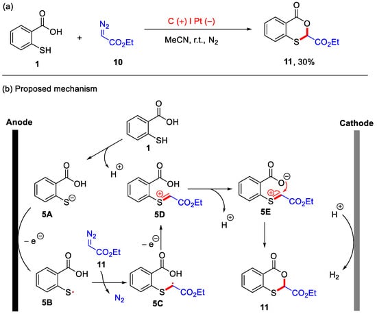 In 2023, the Gu group developed an electrochemical method for the synthesis of 4H-benzo[d][1,3]oxathiin-4-one using thiosalicylic acid and ethyl 2-diazoacetate as starting materials (Scheme 6a) [36]. Although the isolated yield of the desired product 11 was 30%, this method avoided the use of transition metals, external oxidants, and substrate pre-activation. The current conditions proved effective for the electrochemical oxidative difunctionalization of diazo compounds with thiophenol and methanol. Therefore, these are not the optimal conditions for product 11, which suggests significant opportunities for future research to improve synthetic efficiency by optimizing reaction conditions (solvents, electrode materials, additives and temperatures). In addition, a possible mechanism is proposed in Scheme 6b. Initially, thiosalicylic acid 1 undergoes deprotonation to form the thiolate anion 5A. This is followed by anodic oxidation, generating the sulfur radical 5B. The sulfur radical 5B then reacts with ethyl 2-diazoacetate 10, producing the carbon radical intermediate 5C with the concomitant release of N2. Subsequent single-electron oxidation yields intermediate 5D, which subsequently forms the intermediate 5E. Finally, intramolecular nucleophilic addition leads to the formation of the final product 11, while H2 is evolved at the cathode.