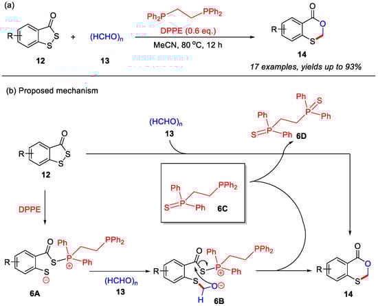 In the past five years, skeletal editing has emerged as a promising strategy for directly modifying heterocyclic frameworks, demonstrating unique advantages and broad application prospects in organic synthesis [37,38,39]. Very recently, the Zhou group reported a novel skeletal editing strategy for the construction of 4H-benzo[d][1,3]oxathiin-4-ones from benzo[c][1,2]dithiol-3-ones and paraformaldehyde. In this transformation, DEEP (diethoxyethylphosphine) served as a crucial additive to enable the skeletal editing process, delivering the desired products in good yields across a range of substituted benzo[c][1,2]dithiol-3-ones [40]. Notably, this strategy involves the replacement of a sulfur atom with a C–O unit through a DEEP-mediated tandem reaction featuring S–S bond cleavage followed by aldehyde cyclization (Scheme 7a).