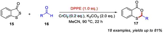 In addition, they also demonstrated that the use of CrCl2 and K2CO3 could enhance the yields of 4H-benzo[d][1,3]oxathiin-4-ones 17 when different aldehydes were employed to react with benzo[c][1,2]dithiol-3-one 15 through a DEEP-mediated skeletal editing strategy (Scheme 8). In the absence of CrCl2 and K2CO3, only a trace amount of the desired product was obtained. In this transformation, CrCl2 served as a reaction accelerator, while K2CO3 functioned as the base [40].