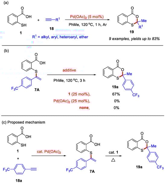 In the past two decades, transition-metal-catalyzed/mediated organic reactions have emerged as powerful strategies for the construction of diverse heterocyclic compounds [41,42,43,44,45,46]. In 2012, the Nishina group developed a palladium-catalyzed method for the synthesis of 4H-benzo[d][1,3]oxathiin-4-ones (Scheme 9a) [23]. In contrast to their metal-free approaches, this palladium-catalyzed system enables thiosalicylic acid to react with various unactivated alkynes, yielding 2,2-disubstituted 4H-benzo[d][1,3]oxathiin-4-ones in moderate to good yields. Notably, the unactivated alkynes employed in this transformation encompassed a range of substituents, including alkyl, aryl, heteroaryl, and ether groups. In addition, the vinyl sulfide 7A was detected during the reaction, indicating that it may be a reaction intermediate. Furthermore, in the absence of thiosalicylic acid, the intermediate 7A failed to provide the desired product 19a. When using catalytic amounts of thiosalicylic acid, the desired product 19a was formed with good yield (Scheme 9b). Based on these observations, a plausible mechanism was proposed (Scheme 9c). Initially, thiosalicylic acid and alkyne undergo Pd-catalyzed addition to form the key vinyl sulfide intermediate 7A, which subsequently undergoes intramolecular cyclization with catalytic thiosalicylic acid to ultimately afford product 19a.