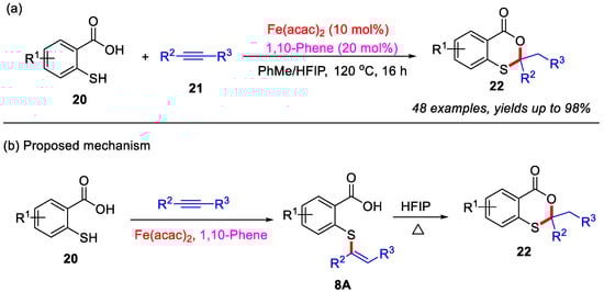 After that, the Kawatsura group in 2017 reported an iron-catalyzed intermolecular coupling reaction between internal alkynes and thiosalicylic acid derivatives for efficient construction of the 4H-benzo[d][1,3]oxathiin-4-ones scaffold (Scheme 10a) [47]. Employing a catalytic system of Fe(acac)2/1,10-phenanthroline in a mixed toluene/hexafluoroisopropanol (HFIP) solvent, diverse 1,3-oxathiane-4-one derivatives were synthesized in moderate to excellent yields. Mechanistic studies revealed that the transformation proceeds through an initial iron-catalyzed intermolecular hydrothiolation of alkynes with thiosalicylic acid derivatives in toluene to form vinyl sulfide intermediate 8A, followed by HFIP-promoted intramolecular cyclization to afford product 22 (Scheme 10b).