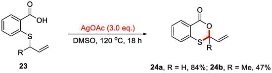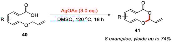 Compared with transition-metal-free methods for 4H-benzo[d][1,3]dioxin-4-ones, there are only a few reports using transition metals. In 2016, the Porcel group reported an Ag-mediated intramolecular allylic C–H bond cyclization of 2-(allyloxy)benzoic acids to construct 4H-benzo[d][1,3]dioxin-4-ones (Scheme 17) [48]. This method is compatible with both electron-rich and electron-deficient substituents on the aromatic ring, affording the desired products in moderate yields. However, the presence of strong electron-withdrawing groups or bulky substituents was not effective in this reaction. Moreover, radical-trapping experiments and electron paramagnetic resonance (EPR) spectroscopic analyses excluded the involvement of a radical pathway, suggesting that the reaction likely proceeds through Ag(I)/Ag(III) species.