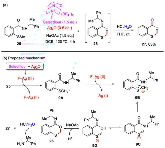 In 2016, the Porcel group reported an Ag-mediated intramolecular allylic C–H bond cyclization for the construction of 4H-benzo[d][1,3]dioxin-4-ones (Scheme 11) [48]. However, this method was limited to substrates containing an allylic group on the sulfur atom. In 2019, the Yang group developed a novel cascade reaction for the synthesis of 4H-benzo[d][1,3]oxathiin-4-ones using 2-methylthiobenzamides as substrates (Scheme 12a) [49]. In this transformation, 2-methylthiobenzamide 25 undergoes Ag/Selectfluor-mediated α-C(sp3)–H functionalization to form 2-(methylthio)-N-(1-phenylethyl)benzooxathiin-4-imine 26, which upon acidic hydrolysis yields 4H-benzo[d][1,3]oxathiin-4-one 27 in a yield of 63%. Notably, only methylthio-containing substrates were compatible under these reaction conditions. In addition, a plausible reaction mechanism is proposed (Scheme 12b). First, Selectfluor oxidizes Ag(I) to generate the reactive F−Ag(III) species, which in turn oxidizes 2-methylthiobenzamide substrate 25 to form the carbon-centered radical 9A and F−Ag(II) species. Next, 9A is further oxidized by the F−Ag(II) species to yield the corresponding carbocation 9B, which subsequently undergoes isomerization to form intermediates 9C and 9D. In the presence of NaOAc, intermediate 9D undergoes intramolecular nucleophilic cyclization to afford imine product 25. Finally, acidic hydrolysis of 26 produces the final product 27.