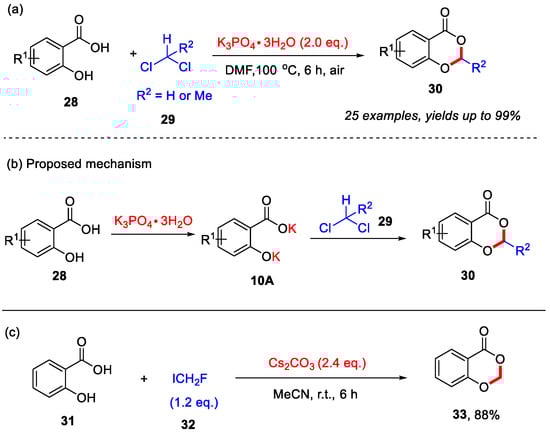 Previous transition-metal-free approaches for the synthesis of 4H-benzo[d][1,3]dioxin-4-ones from salicylic acids often require sulfuric acid or SOCl2 [50,51]. In 2014, the Cui group reported a transition-metal-free method for synthesizing 4H-benzo[d][1,3]dioxin-4-ones from salicylic acids and dichloromethane or 1,1-dichloroethane (Scheme 13a) [52]. In this reaction, K3PO4·3H2O was employed as the base to promote the cyclization process. This approach exhibited good functional group tolerance, and various substituted salicylic acids were successfully utilized to afford the corresponding products in moderate to excellent yields. Mechanistic studies indicated that the initial deprotonation of salicylic acid by K3PO4·3H2O generates the salt 10A, which undergoes nucleophilic substitution-cyclization with dichloromethane or 1,1-dichloroethane to form the desired product (Scheme 13b). Furthermore, the Pace group in 2020 found that fluoroiodomethane (ICH2F) could serve as an electrophilic reagent to react with salicylic acid under mild basic conditions, affording 4H-benzo[d][1,3]dioxin-4-one in a yield of 88% (Scheme 13c) [53].