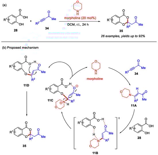 In 2018, the Qiu group developed an organocatalysis strategy for the construction of 4H-benzo[d][1,3]dioxin-4-ones from salicylic acids and substituted enones. Morpholine was employed as the organic catalyst to facilitate this reaction through a dual Michael cascade reaction under mild conditions (Scheme 14a) [54]. In addition, a plausible reaction mechanism is proposed in Scheme 14b. Initially, morpholine reacts with enone 34 to form the α,β-unsaturated enamine intermediate 11A, which coordinates with salicylic acid through transition state 11B, leading to the formation of intermediate 11C. Subsequently, intermediate 11C undergoes elimination to regenerate morpholine and yield intermediate 11D. Finally, the intramolecular Michael addition of 11D affords the desired product 35.
