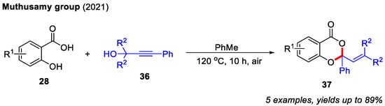 In 2021, the Muthusamy group found that propargyl alcohols could readily react with salicylic acids to afford 4H-benzo[d][1,3]dioxin-4-ones. In contrast to Qiu’s work, propargyl alcohols could be directly activated under reflux conditions. Notably, α,β-unsaturated carbonyl intermediates were not involved in this transformation (Scheme 15) [25].