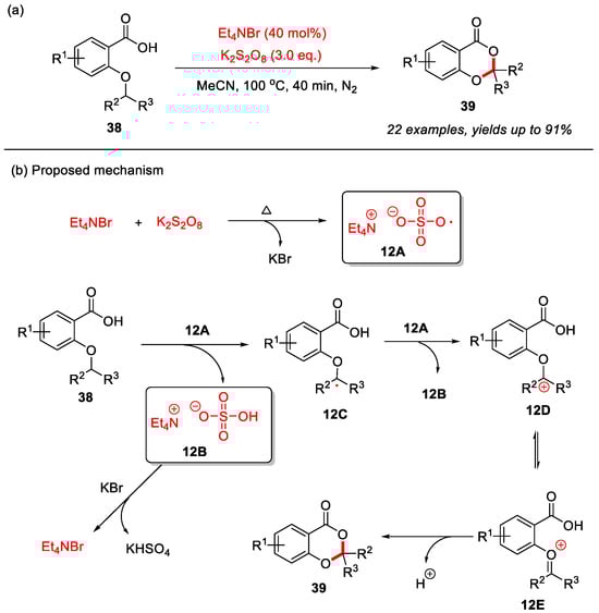 In 2023, the Jana group reported an Et4NBr-catalyzed and K2S2O8-mediated intramolecular α-C(sp3)–H bond cyclization of 2-alkyloxybenzoic acids for the construction of 4H-benzo[d][1,3]dioxin-4-ones (Scheme 16a) [30]. In this transformation, K2S2O8 serves as the oxidant in a radical mechanism, where Et4NBr is initially oxidized by K2S2O8 under heating to generate the key bromine radical intermediate 12A. Intermediate 12A abstracts the α-C(sp3)–H bond of the 2-alkyloxy group to form intermediate 12B and alkyl radical 12C. Subsequently, alkyl radical 12C is further oxidized by 12A to generate carbocation intermediate 12D and its isomer 12E. Finally, intramolecular nucleophilic attack by the carboxyl group completes the cyclization to form the desired product 39. Meanwhile, intermediate 12B reacts with KBr to regenerate Et4NBr and produce KHSO4 (Scheme 16b).