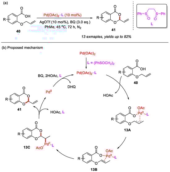 In addition, a plausible mechanism was proposed (Scheme 18b). Initially, Pd(OAc)2 coordinates with the bis(phenyl sulfoxide) ligand L to form the complex Pd(OAc)2·L, which subsequently reacts with 2-(allyloxy)benzoic acid to generate the (π-allyl)palladium intermediate 13A. This intermediate then undergoes palladium-assisted double-bond isomerization to yield intermediate 13B. Following this, intermediate 13B undergoes intramolecular cyclization to yield intermediate 13C, which is then subjected to β-hydride elimination, leading to the formation of the desired product and regeneration of Pd(0). Finally, Pd(0) is oxidized back to Pd(II) by benzoquinone (BQ), thereby completing the catalytic cycle.