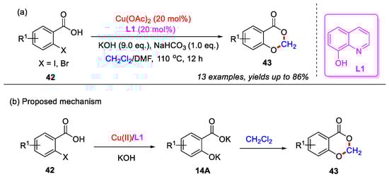 In 2017, the Liu group developed a Cu(II)-catalyzed cascade hydroxylation and etherification methodology for the synthesis of 4H-benzo[d][1,3]dioxin-4-ones (Scheme 19a). In this approach, o-halobenzoic acid 42 was initially reacted with potassium hydroxide to generate intermediate 14A through a Cu(II)-catalyzed Ullmann-type C–O coupling reaction. Following this, intermediate 14A underwent a double Williamson etherification with dichloromethane, yielding the final product 43 (Scheme 19b) [56].