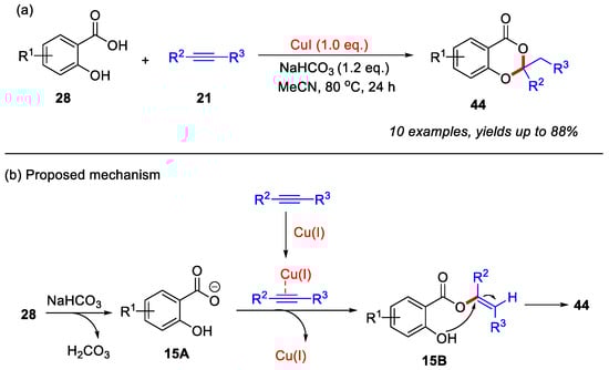 After that, the Babu group in 2021 reported the first Cu(I)-mediated synthesis of 4H-benzo[d][1,3]dioxin-4-ones from salicylic acids and acetylenic esters. Both mono- and disubstituted acetylenic esters were found to be suitable reaction partners. A plausible reaction mechanism is proposed, as outlined in (Scheme 20b). The initial deprotonation of salicylic acid by NaHCO3 leads to the formation of intermediate 15A. Concurrently, the acetylenic ester is activated by Cu(I) species and subsequently reacts with intermediate 15A to generate intermediate 15B. This intermediate 15B then undergoes intramolecular cyclization, ultimately yielding the desired product 44 [57].