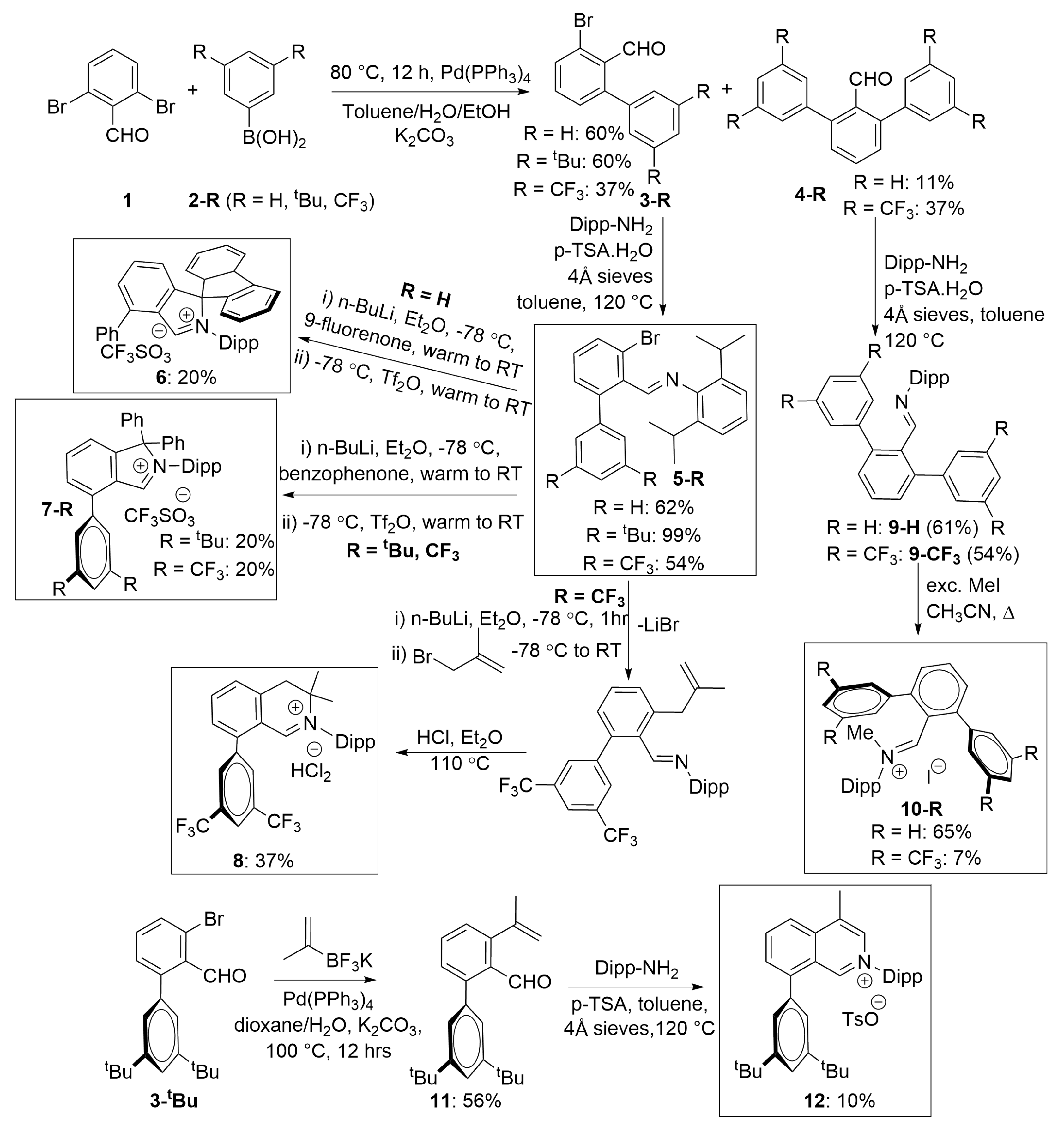 - Jazzar, R.; Bourg, J.B.; Dewhurst, R.D.; Donnadieu, B.; Bertrand, G. Intramolecular “Hydroiminiumation and -Amidiniumation” of Alkenes: A Convenient, Flexible, and Scalable Route to Cyclic Iminium and Imidazolinium Salts. J. Org. Chem. 2007, 72, 3492–3499. [Google Scholar] [CrossRef]