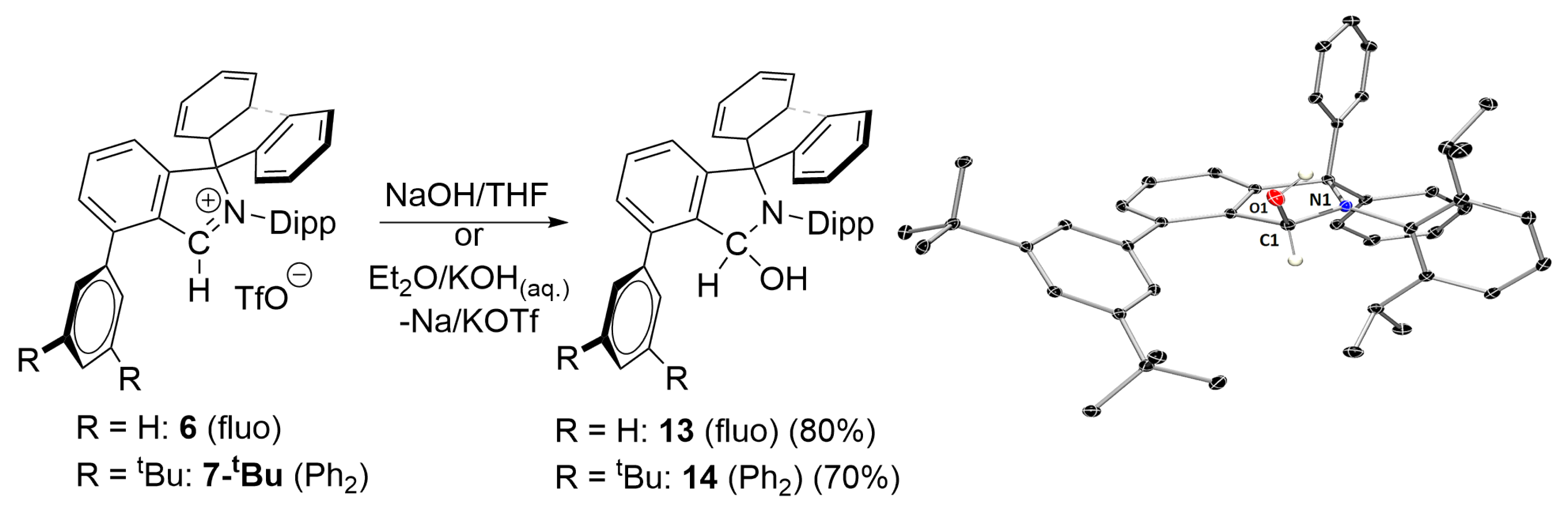 - Das, A.; Elvers, B.J.; Nayak, M.K.; Chrysochos, N.; Anga, S.; Kumar, A.; Rao, D.K.; Narayanan, T.N.; Schulzke, C.; Yildiz, C.B.; et al. Realizing 1,1-Dehydration of Secondary Alcohols to Carbenes: Pyrrolidin-2-Ols as a Source of Cyclic (Alkyl)(Amino)Carbenes. Angew. Chem. Int. Ed. Engl. 2022, 61, e202202637. [Google Scholar] [CrossRef] [PubMed]