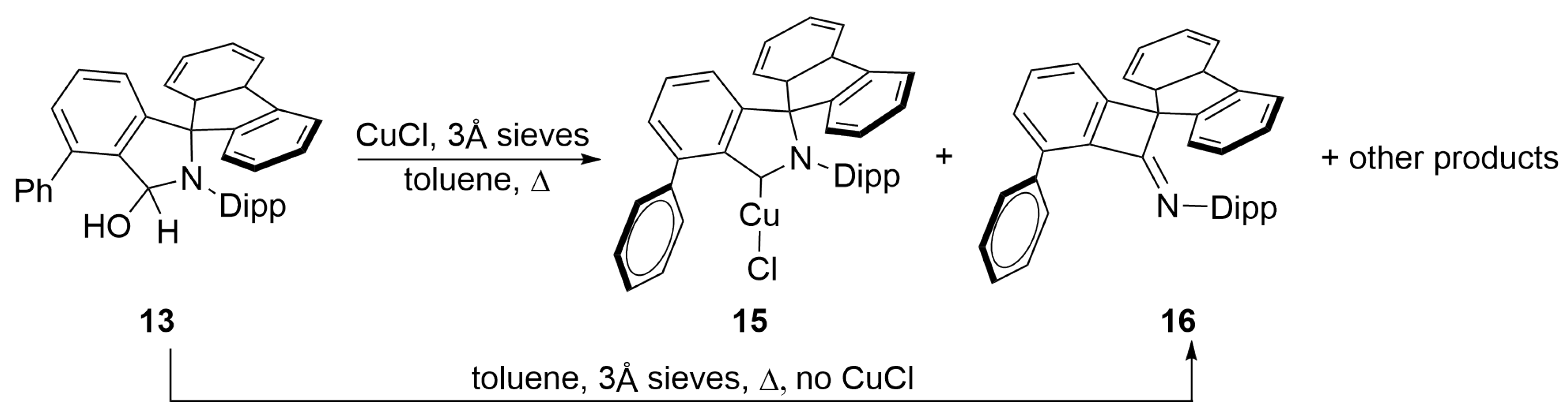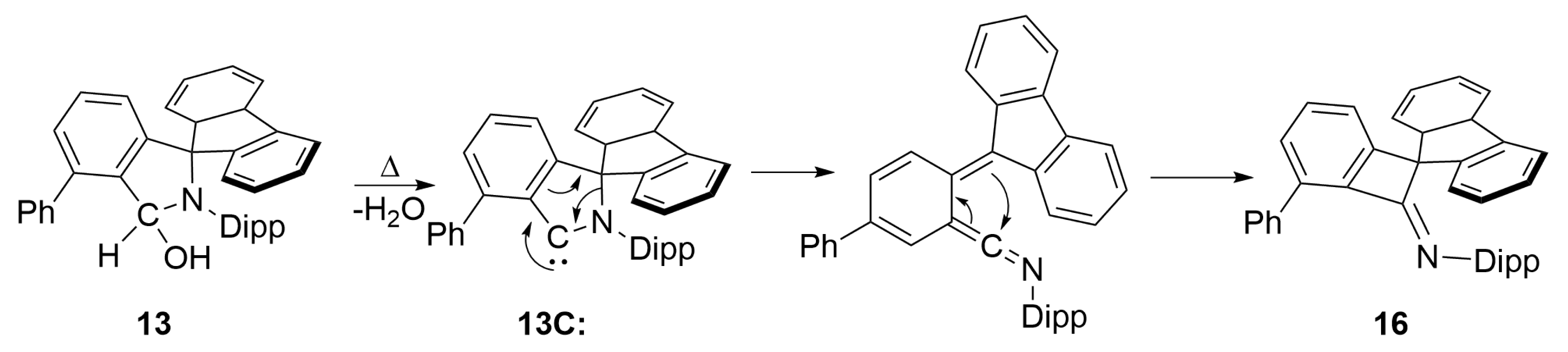 - Lorkowski, J.; Krahfuß, M.; Kubicki, M.; Radius, U.; Pietraszuk, C. Intramolecular Ring-Expansion Reaction (RER) and Intermolecular Coordination of In Situ Generated Cyclic (Amino)(Aryl)Carbenes (CAArCs). Chem. Eur. J. 2019, 25, 11365–11374. [Google Scholar] [CrossRef] [PubMed]