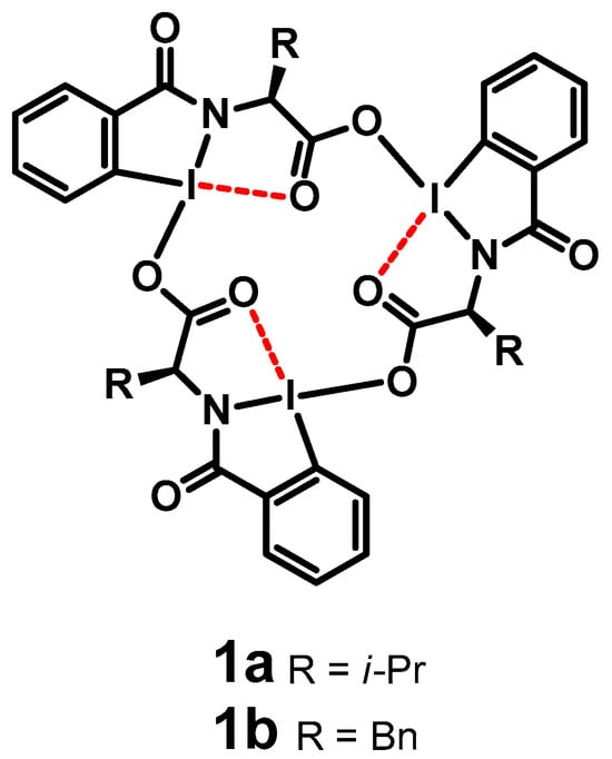 - Zhdankin, V.V.; Koposov, A.E.; Smart, J.T.; Tykwinski, R.R.; McDonald, R.; Morales-Izquierdo, A. Secondary Bonding-Directed Self-Assembly of Amino Acid Derived Benziodazoles: Synthesis and Structure of Novel Hypervalent Iodine Macrocycles. J. Am. Chem. Soc. 2001, 123, 4095–4096. [Google Scholar] [CrossRef] [PubMed]