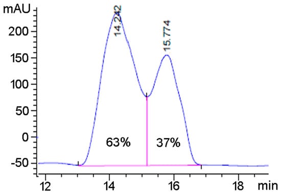 Chiral chromatogram of enantioenriched 6a upon functionalization with 3a. Percentage listed is the enantiomeric excess based on Area1: 21,039, Area 2: 12,305.