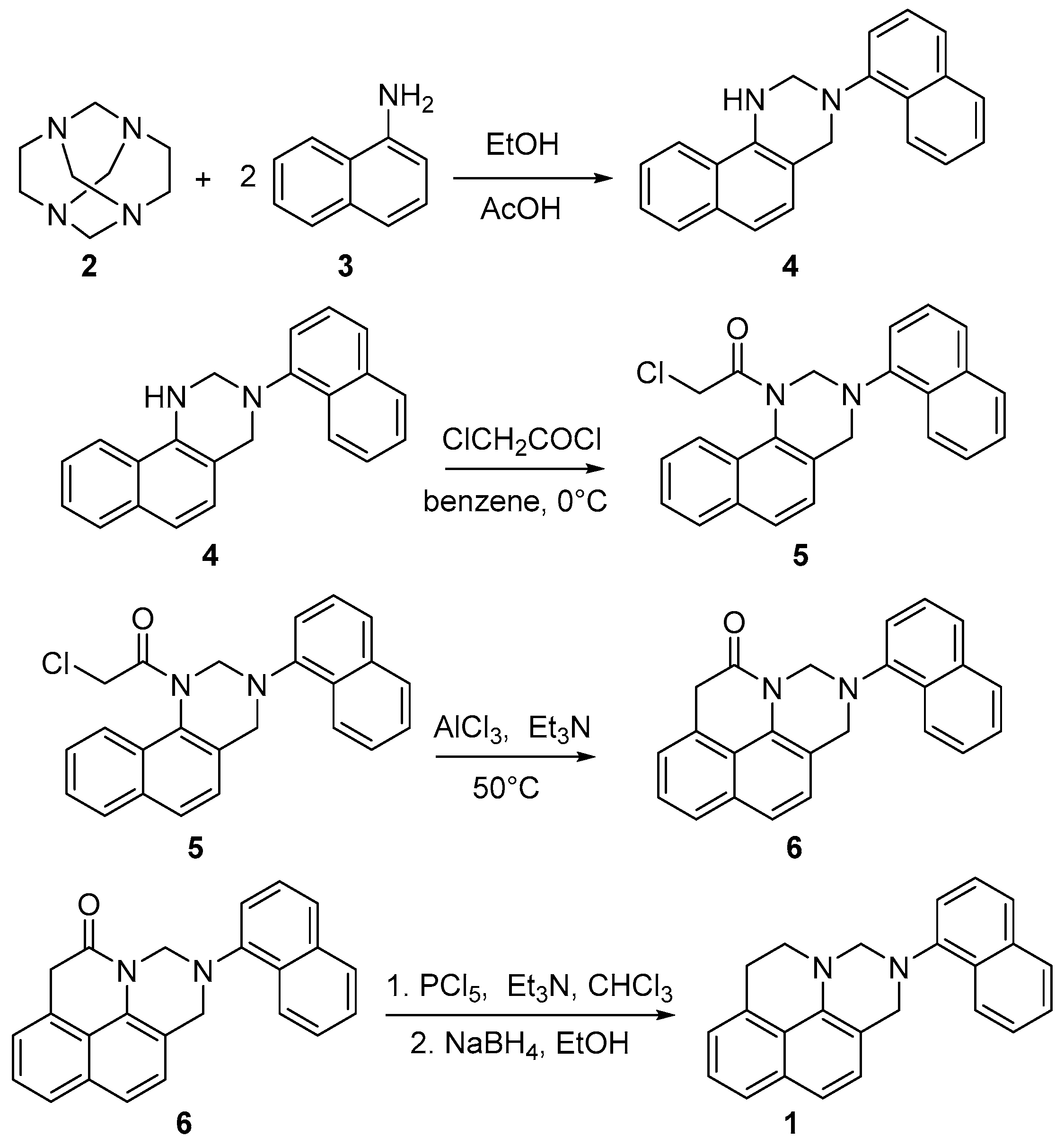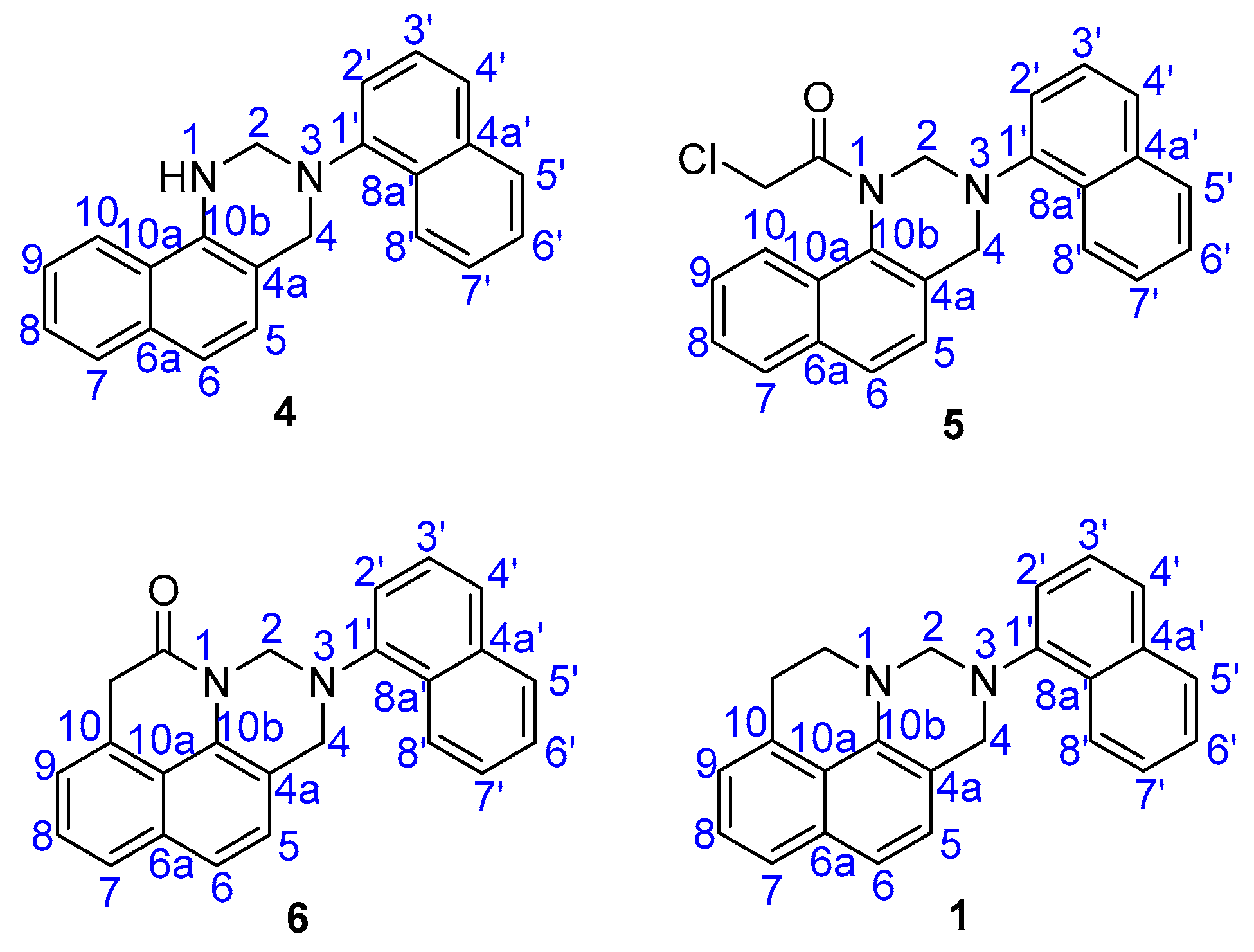 3.2.4. Synthesis of 2-(Naphthalen-1-yl)-2,3,5,6-tetrahydro-1H-isoquinolino[8,1,2-hij]quinazoline 1