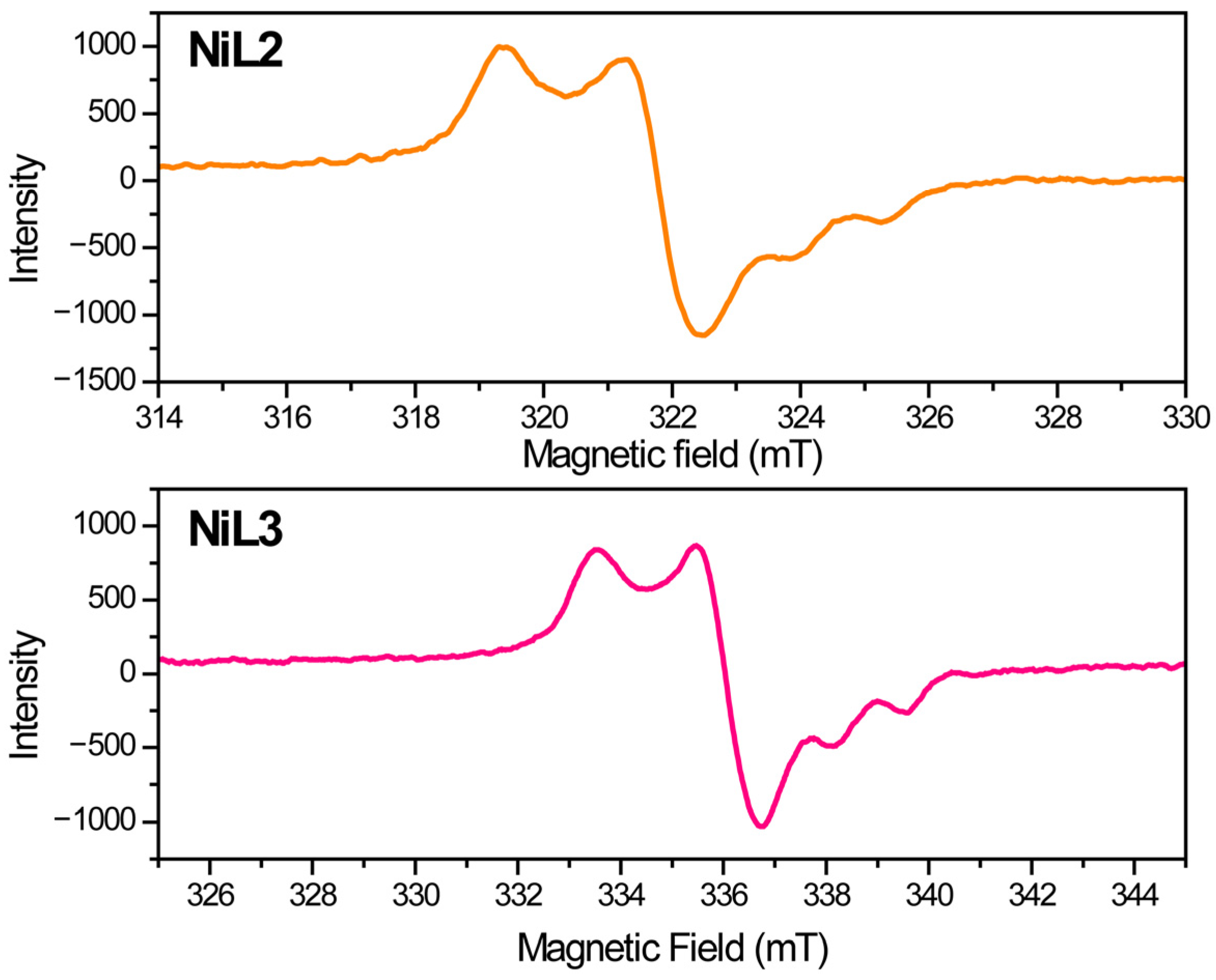- Freire, C.; de Castro, B. Epr Characterisation of Nickel (III) Complexes with N2O2 Schiff Base Ligands Derived from Naphthaldehyde and Their Pyridine Adducts. Polyhedron 1998, 17, 4227–4235. [Google Scholar] [CrossRef]