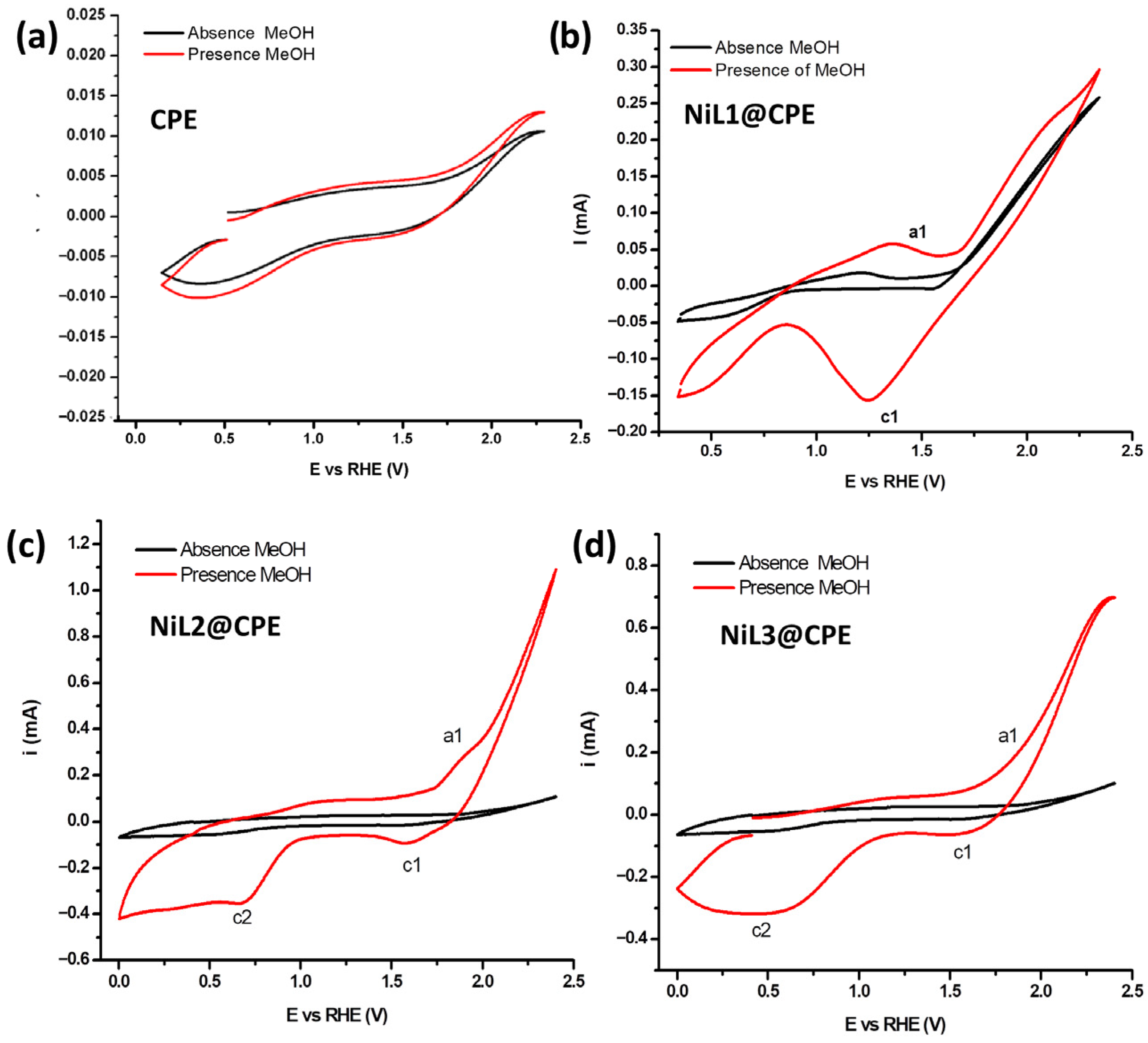 | NiL2@CPE | 1.88 | 1.60 | 0.3 M MeOH/0.1 M NaOH. Scan rate 0.1 V s−1 | |