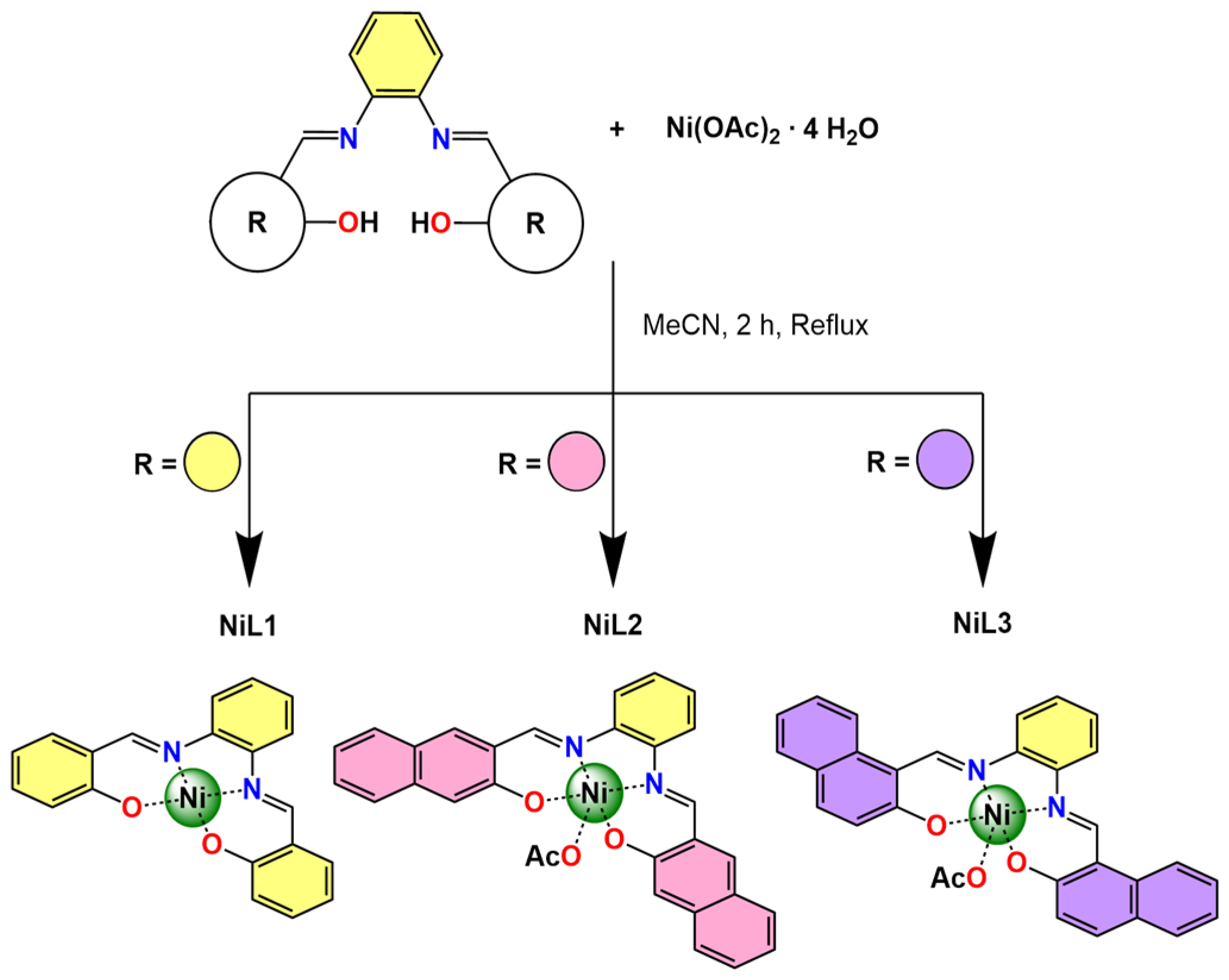 - Luo, M.; Zhu, P.; Chen, F.; Deng, M.; Gan, Q.; Chen, L. Synthesis and Composition Determination of 2-Hydroxy-1-Naphthalene Formaldehyde o-Phenylenediamine Schiff Base and Its Copper(II) Complexes: An Introduction of a Comprehensive Chemical Experiment. Univ. Chem. 2020, 35, 152–160. [Google Scholar] [CrossRef]