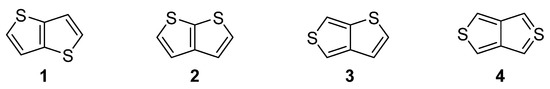 - Perepichka, I.F.; Perepichka, D.F. Thienothiophenes. In Handbook of Thiophene-Based Materials: Applications in Organic Electronics and Photonics, 1st ed.; John Wiley & Sons, Inc.: Chichester, UK, 2009; pp. 219–233. ISBN 9780470745533. [Google Scholar]