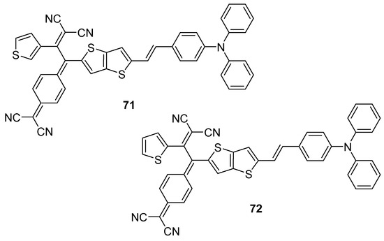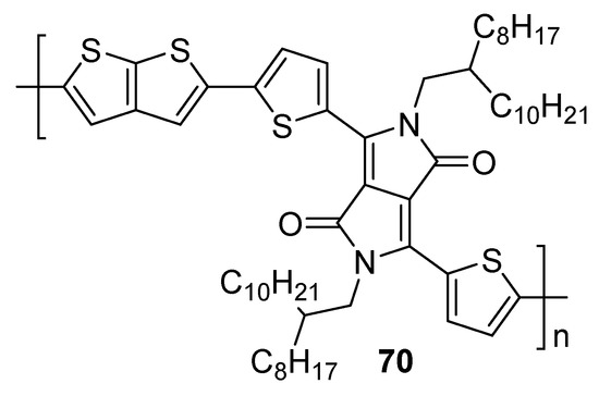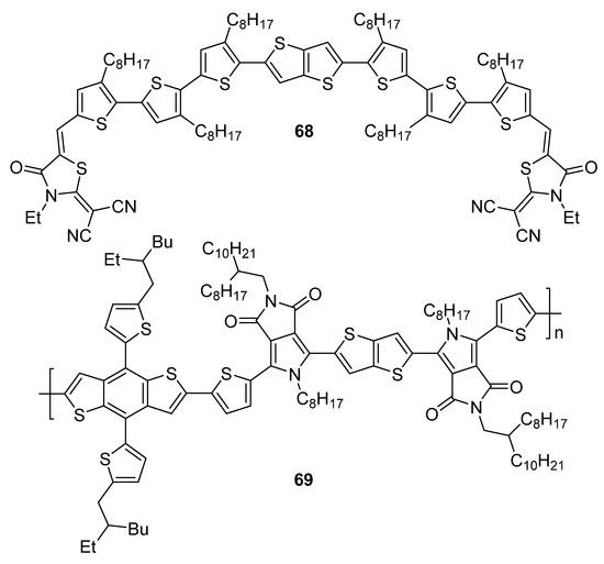 Electron rich thieno[3,2-b]thiophene derivatives 68 [17] and 69 [54] (Figure 6) may be also utilized as electron-donor materials in BHJs. The monomeric 68 possesses an A-π-D-π-A arrangement with the TT 1 central core, equipped with additional thienyl linkers and terminal acceptors, at positions 2 and 5. TT 1 has also been used as an alternating structural motif of the polymeric 69. As can be seen from Table 5, the hole mobility and fill factors (FF) of both derivatives are almost identical but the BHJ constructed with 68 showed a higher power conversion efficiency (PCE 7.91 vs. 5.21%). Structurally similar to 69, TT 2 can be also combined with the diketopyrrolopyrrole units to gain the D/A alternating polymer 70 (Figure 7) [55]. The BHJ bearing 70, as an active layer, reached the PCE of 2.9% (Table 5).