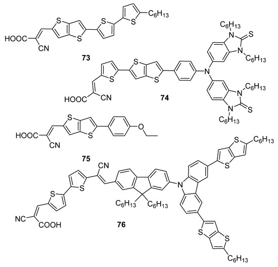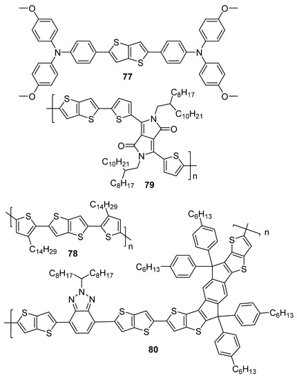 The emitting layer of OLEDs can be built-up on TT derivatives, Figure 3 shows two selected examples 60 and 61 with thieno[3,2-b]thiophene incorporated into a polymeric backbone [16]. Both derivatives differ in the pentyl substitution of the thienothiophene scaffold.