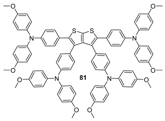 A series of substituted thieno[3,2-b]thiophene derivatives 63–67 was developed as OLED emitters, by Isci et al. (Figure 5) [53]. A common feature of all derivatives is the 4-cyanophenyl substituent at position 3, while the additional fluorescent π-systems, such as triphenylamine (TPA) or the tetraphenylethylene (TPE) moieties were appended. When judging the fundamental parameters in Table 4, the derivative 63, bearing one triphenylamine moiety, showed the highest brightness and current efficiency.