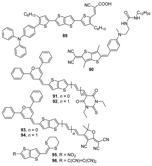 In principle, the heterocyclic system of TTs with a polarizable cloud of π-electrons can be used as a NLO medium. For instance, the switchable second-order NLO properties were reported for the thieno[3,2-b]thiophene derivative 89 (Figure 14) doped by graphene quantum dots [68]. A significant polarization of the electron cloud of 89 occurred when exposed to the electric field with the subsequent electron transfer to the graphene quantum dots. The push–,pull derivative 90 (Figure 14) bearing the TT moiety in a quinoid arrangement, was exploited for the xerogel structure study [69]. Micrographs of this derivative were studied by SHG microscopy.