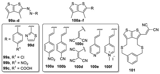 Nonlinear properties of the thieno[2,3-b]thiophene derived compounds were investigated by Mashraqui et al. Two series of TT derivatives 99a–d and 100a–f (Figure 16), bearing the (hetero)aromatic azo or electron-withdrawing substituent at the position 2, were prepared [13]. The Hyper–Rayleigh scattering (HRS) was used to determine their first hyperpolarizabilities (Table 12). As can be seen, the variation of the peripheral substituent tunes’ both linear and nonlinear optical properties, are within the range of 368–442 nm and 4–17 × 10−30 esu. Whereas pyridinium chromophore 100f showed the most bathochromically shifted absorption maxima, TTazophenylencarboxylic acid 99c possesses the largest second-order NLO response. In addition, the same authors have also prepared the cyclophane derivative 101 [72] with an average nonlinearity.
