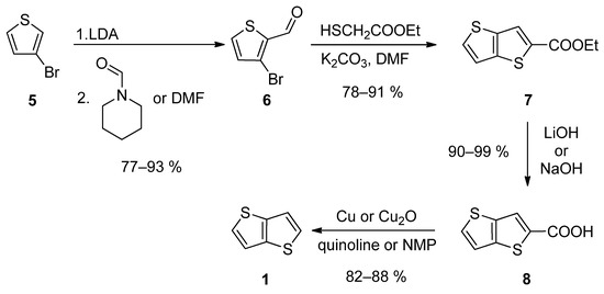 The first synthetic approach outlined in Scheme 1, consists of a four-step reaction sequence entitled Method 1 [24,25,26,27,28]. 3-bromothiophene 5 was selectively lithiated at position 2 using LDA and the formed lithium species was trapped by the reaction with N-formylpiperidine [24,25,28] or N,N-dimethylformamide (DMF) [26], affording aldehyde 6. It further underwent a cyclization with ethyl thioglycolate, in the presence of potassium carbonate as a base. Both C=C and C-S bonds in 7 were established within this step. Using lithium or sodium hydroxide, ester 7 was hydrolysed to carboxylic acid 8, which underwent a final decarboxylation, accomplished either by Cu/quinoline [25] or Cu2O/N-methyl-2-pyrrolidone (NMP) [28]. The overall yield of this reaction sequence is about 50%.