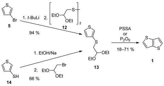TT 1 can be also prepared by a two-step synthesis via acetal 13, as a key precursor (Scheme 3). It can be prepared either from 3-bromothiophene 5 or thiophene-3-thiol 14 [32,33]. The lithiation of 5 provided intermediate 3-lithiumthiophene, which reacted with disulfide 12 [33]. Alternatively, thiolate generated by deprotonation of the starting thiophene-3-thiol 14, substitutes bromine in 2,2-diethoxyethylbromide [32]. The final cyclization of 13 to 1 was assisted either by poly(4-styrene)sulphonic acid (PSSA) or phosphorous oxide [32,33]. The overall yields were 12% [32] and 67% [33], respectively.