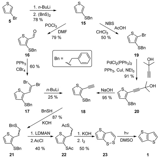 A comprehensive eight-step synthetic sequence towards TT 1 has been reported by Schroth et al. [34] (Scheme 4). The starting 3-bromothiophene 5 was converted to sulphide 15 via lithiation and the reaction with dibenzyldisulphide. The further synthetic steps involved the preparation of alkyne 18, either via the Vilsmeier–Haack formylation (15–16), the Corey–Fuchs dibromoolefination (16–17) and treatment with n-BuLi or the bromination with N-bromosuccinimide (NBS), affording 19 with the subsequent Sonogashira cross-coupling (19–20) and the final deprotection of the formed acetylene with sodium hydroxide. The next joint step is an addition of benzylthiol and the replacement of two benzyl groups in 21, by the acetyl groups by lithium 1-(N,N-dimethylamino)naphtalenide (LDMAN) and acetyl chloride. Thioester 22 underwent an alkaline hydrolysis and oxidation affording bisulphide intermediate 23, which rearranged to 1 under the irradiation with daylight. The overall yield of Method 4 is 2% for pathway, using the Vilsmeier–Haack formylation. Considering the pathway containing the Sonogashira reaction, the overall yield toward the final intermediate 23, is 6%. The yield of the last photochemical reaction step is given in the literature.