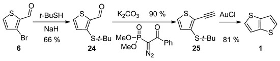 3-Bromothiophene-2-carbaldehyde 6 was used in a three-step synthetic pathway (Scheme 5) [35]. The bromine atom in 6 was substituted with the aid of sodium tert-butylthiolate to aldehyde 24, which underwent the Seyferth–Gilbert homologization, using dimethyl-1-diazo-2-oxo-phenylethylphosphonate. In the final step, the terminal alkyne 25 was cyclized to target 1 under the catalysis of gold(I) chloride with an overall yield of 48%.