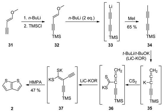 1-Methoxy-1-en-3-yne 31 was utilized in Method 7 (Scheme 7) [37,38,39,40]. Its TMS-protection, lithiation (33) and methylation with iodomethane afforded diyne 34. These transformations can be also performed as a one-pot reaction [39]. The final step(s) involved three in-situ potassium intermediates 35–37. The first allene 35 is generated by treating 34 with the superbase LiC-KOR. Further reaction with carbon disulfide afforded 36, which provided diyne-bis(thiolate) 37, by adding LiC-KOR again. The cyclization of diyne-bis(thiolate) 37 in the presence of hexamethylphosphoric acid triamide (HMPA) yielded the target TT 2 in a 40% overall yield.