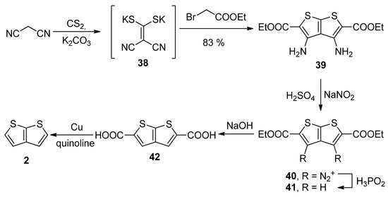 Similarly to the key intermediate of Method 7—diyne-bis(thiolate) 37, Method 8 utilizes dicyano-bis(thiolate) 38 (Scheme 8) [41], which was prepared from malononitrile and carbon disulphide. Its reaction with two ethyl-bromoacetates provided the tetrasubstituted TT derivative 39. The amino groups at positions 3 and 4 were removed by diazotization (40) and the reaction with hypophosphorous acid towards molecule 41. The esters were hydrolysed and the corresponding dicarboxylic acid 42 underwent the final decarboxylation to the unsubstituted thieno[2,3-b]thiophene 2 in a 30% overall yield.