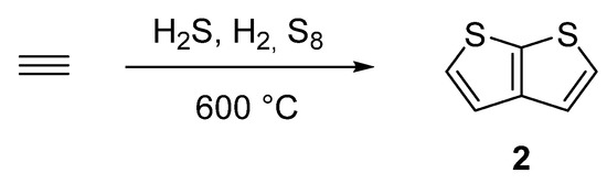 One of the oldest synthetic attempts towards TT 2, is depicted in Scheme 10 [43,44,45,46]. Among other side products, a gas phase condensation of acetylene with various mixtures of sulphane, hydrogen or elementary sulphur at 600 °C afforded 2 with an unspecified yield. Hence, the synthetic utilization of this procedure is rather low.